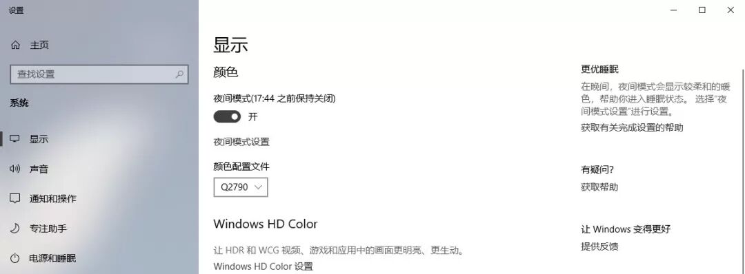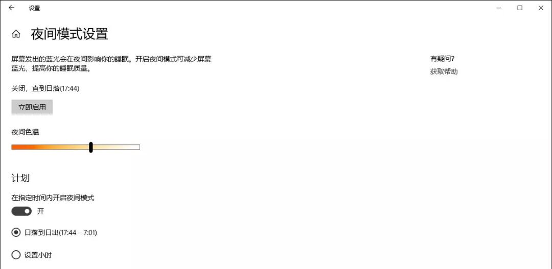 现在对着电脑工作的时间越来越长,小鑫的眼睛也越来越酸。因此小鑫在大学的时候便开始使用各种夜间模式小软件,把屏幕色调暖。现在win10也整合了这一个小功能,打开方式同样是右下角的通知中心。还可以通过右键的设置,,设置适合适合自己的一个色温值,也可以让夜间模式随着日落日出自动开启关闭。