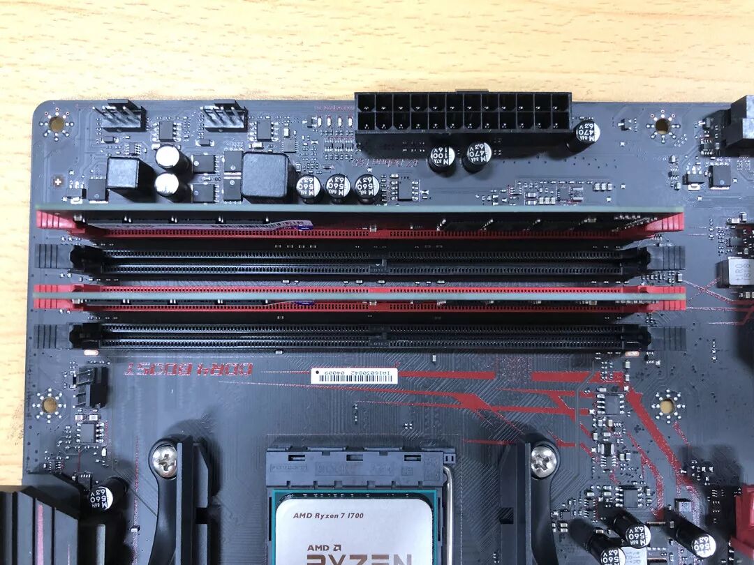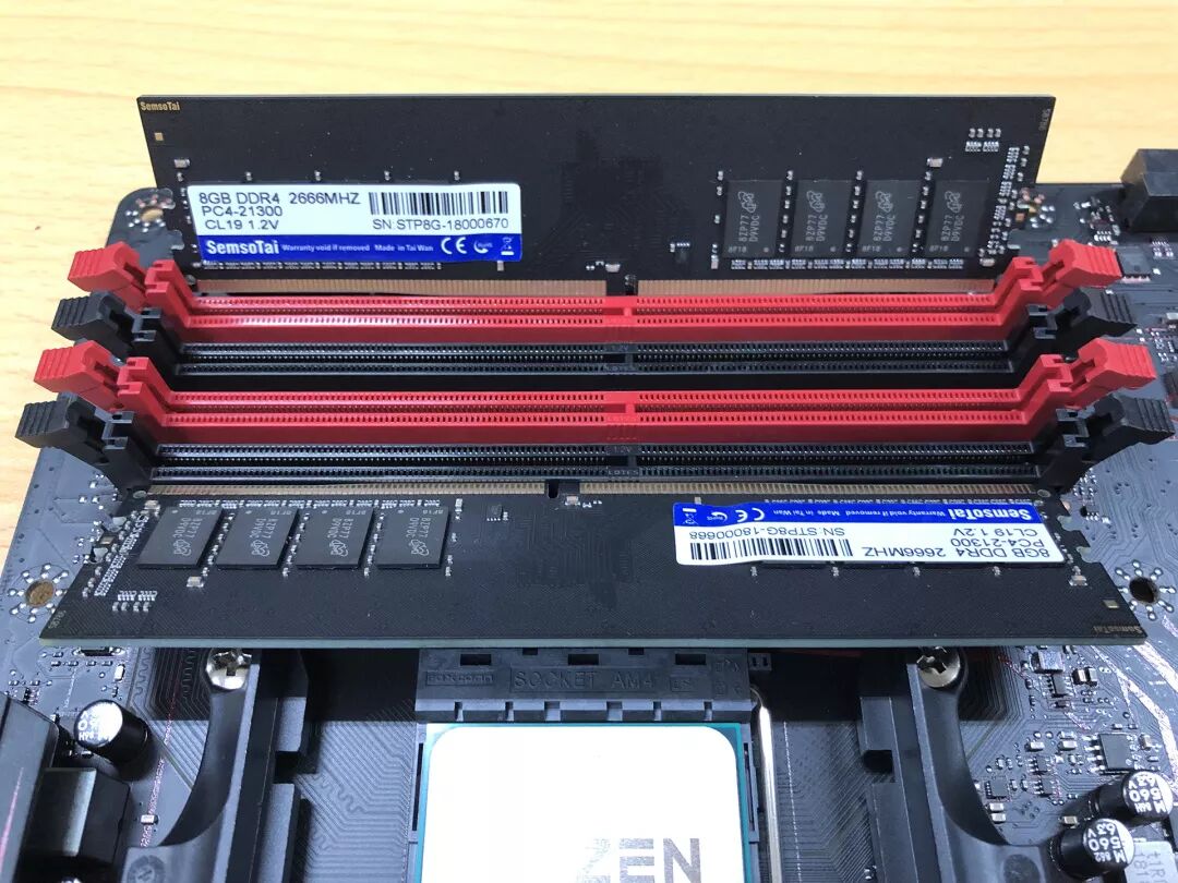 本次装机的安装是两条内存,而主板上是四条内存插槽,根据主板厂商的惯例,安装在相同颜色的两条插槽上就默认的双通道,如果相同颜色就最好查阅一下主板说明书确认那两条是双通道。关于内存的安装,只要看对齐内存和插槽的缺口位置,然后用力按入插槽,听到两声哒哒声就说明内存成功装入。