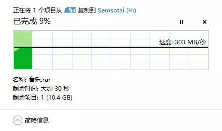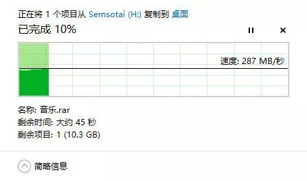 再测试从小鑫电脑里面拷入和拷出的一个十几G的音乐压缩包,可以看到峰值状态都有那么多280~300MB/s。和跑分的数据基本一致。在日常的生活中,拷贝办公文件,拷贝电影啥的都是一两分钟的事,就是拷贝大的工程文件,也比以前的机械式的移动硬盘快上十倍以上。